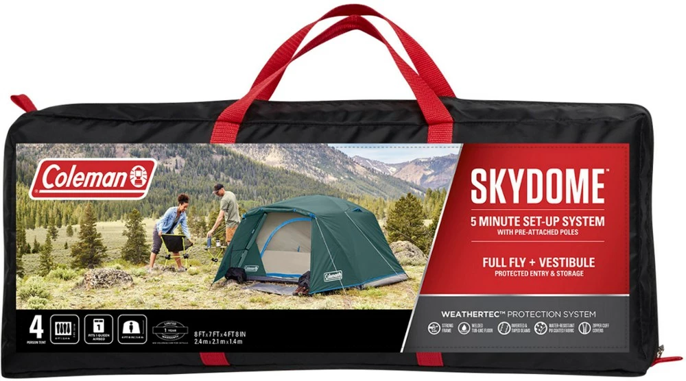 With a simple, spacious design that sets up in under 5 min., the Coleman Skydome 4-person tent lets you spend more time relaxing at your campsite and less time messing with gear.