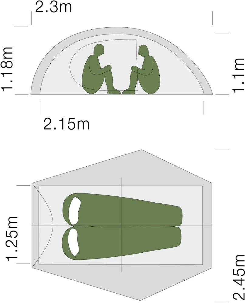 - Steep tent walls maximize headroom and volume; rectangular floor plan fits 2 sleeping mats and ensures efficient use of space