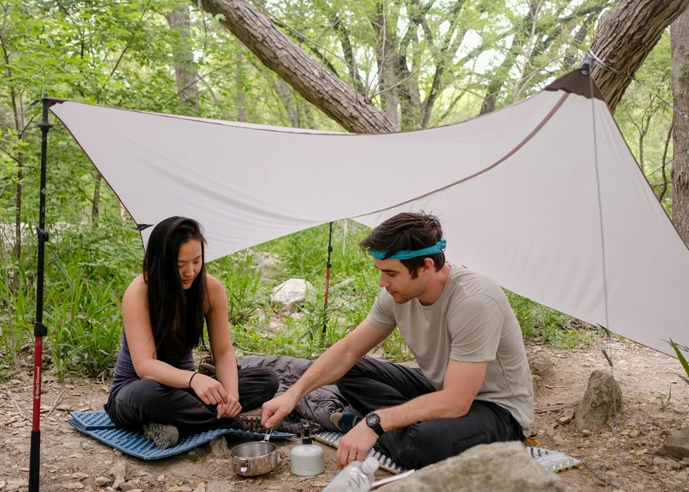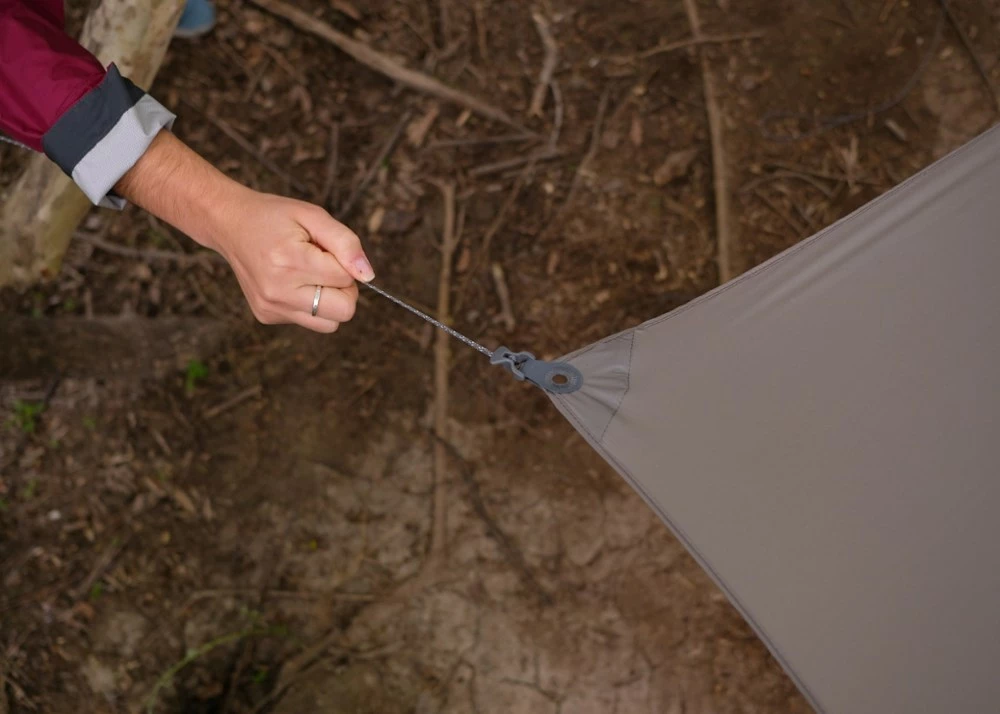 - Knotless design allows for easy setup; line-lock and tensioners suspend the camping tarp above you