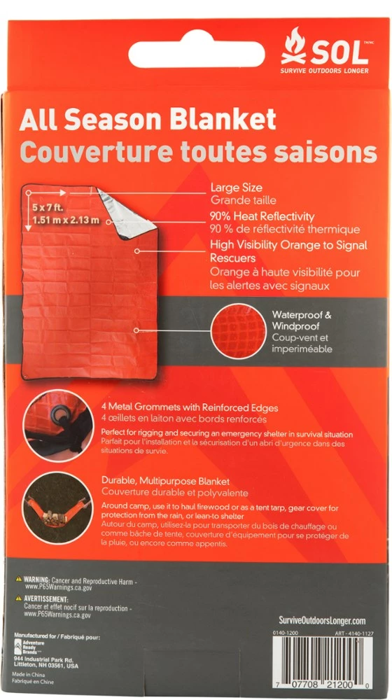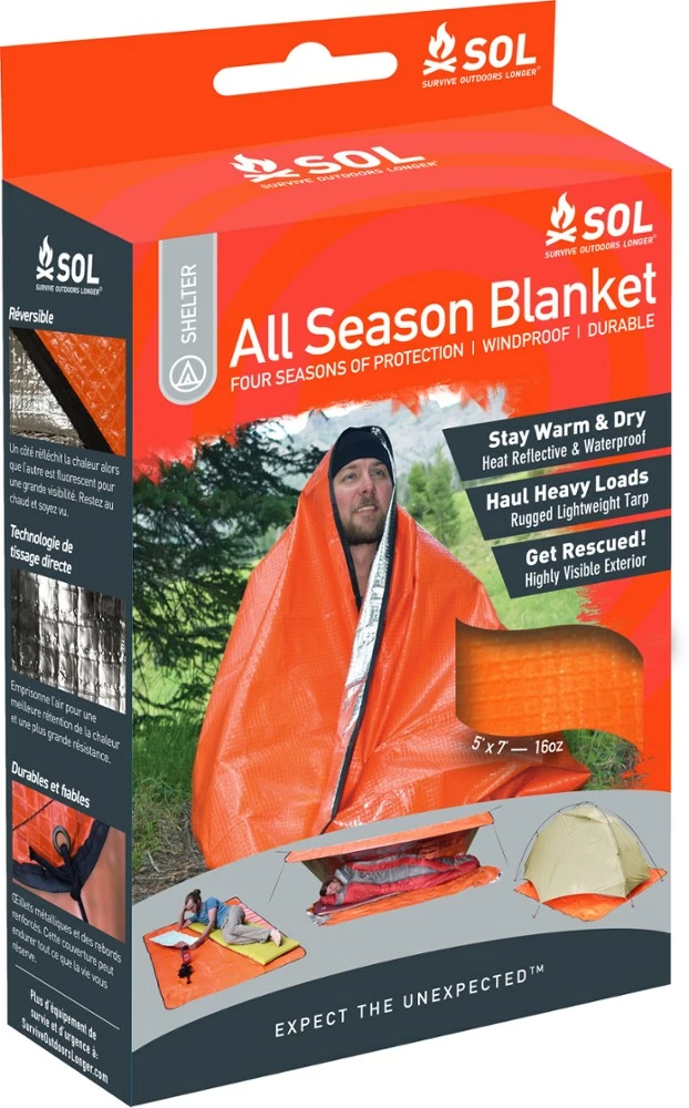 - Compact and waterproof, the All Season Blanket can help protect against hypothermia and keep you dry or to signal rescue teams with the bright orange color